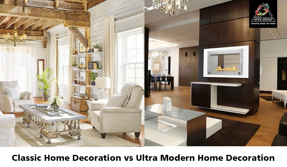 Ultra-Modern Décor usually involve a lot of artistic wooden furniture, heavy shimmering chandeliers & fixtures, wood panel flooring with abstract & vivid wall paints like electric blue, apple-green shade, deep mauve etc. The selection for interior furnishing is more trendy and fashionable with expensive adornments to give a glamorous approach to the house. The modern interior decoration is more detail oriented with every accessory and fittings up-to-date with Bokhara rugs on the floors and color-splashed artistic paintings on the wall. Mostly every room has an abundance of artistic furniture with modern fireplace settings and luxurious sculptures. Modern Home Décor brings out a bold personality in a room and tends to get more crowded and seems like a lot of interior space is occupied. Modern Décor is more creative and loud requiring the skills of a professional who has an eye for aesthetics whereas classic décor is more inclined towards keeping it spacious and beautifully plain with less furnishing but artfully displayed.